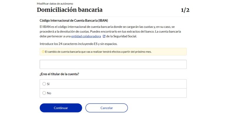 Ahora solo te queda introducir la nueva cuenta bancaria, debiendo poner los 24 caracteres (incluyendo ES y sin espacios). También deberás indicar si eres el titular de la cuenta o no. Por último, haz clic en el botón Continuar y confirma el cambio de domiciliación de tu cuota de autónomos en la siguiente pantalla.