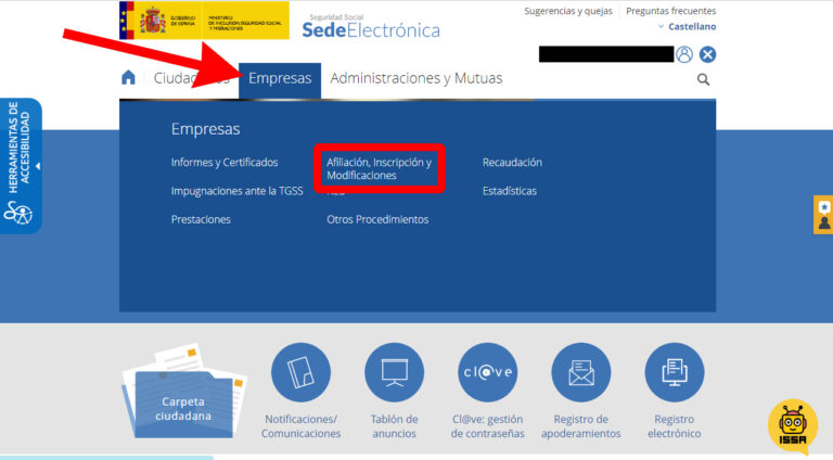 Una vez dentro de tu cuenta de la Sede Electrónica, mira arriba del todo y haz clic sobre Empresas para desplegar el menú; a continuación, selecciona Afiliación, Inscripción y Modificaciones.