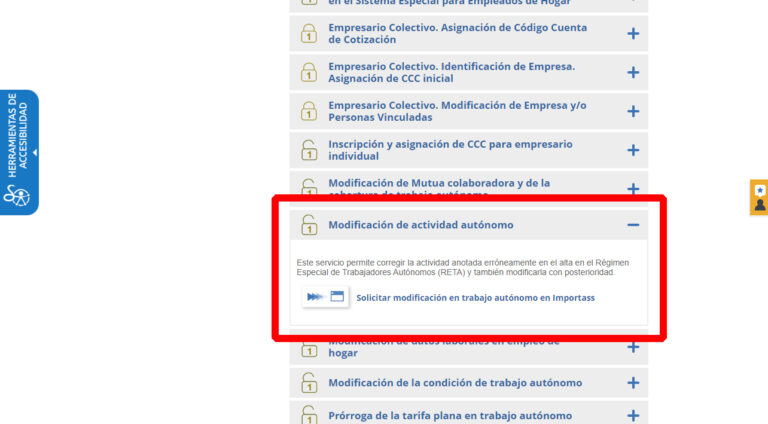También podemos llegar hasta aquí accediendo a través del portal Importass. Para ello, solo hay que entrar al portal con el sistema de identificación, hacer clic en Altas, bajas y modificaciones y buscar Modificación de datos de trabajo autónomo. Al final, vamos a acabar en la misma página web independientemente del camino elegido.